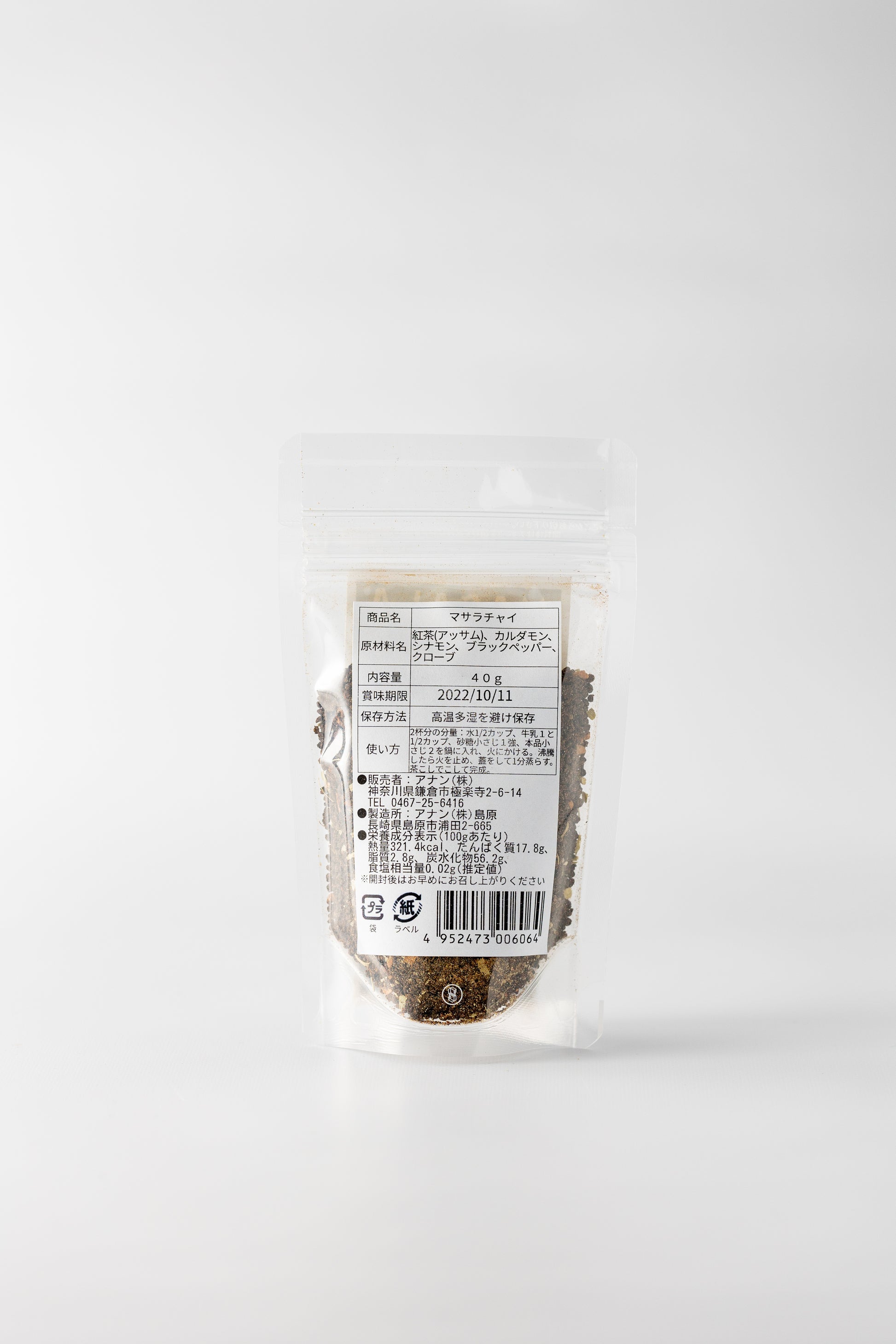 鎌倉アナンスパイスのマサラチャイ。厳選された香りよりスパイスと紅茶のブレンド。紅茶(アッサム)カルダモン、シナモン、ブラックペッパー、クローブ。牛乳や豆乳、オーツミルクなどと一緒に煮込んで温かいチャイとしてお楽しみください。